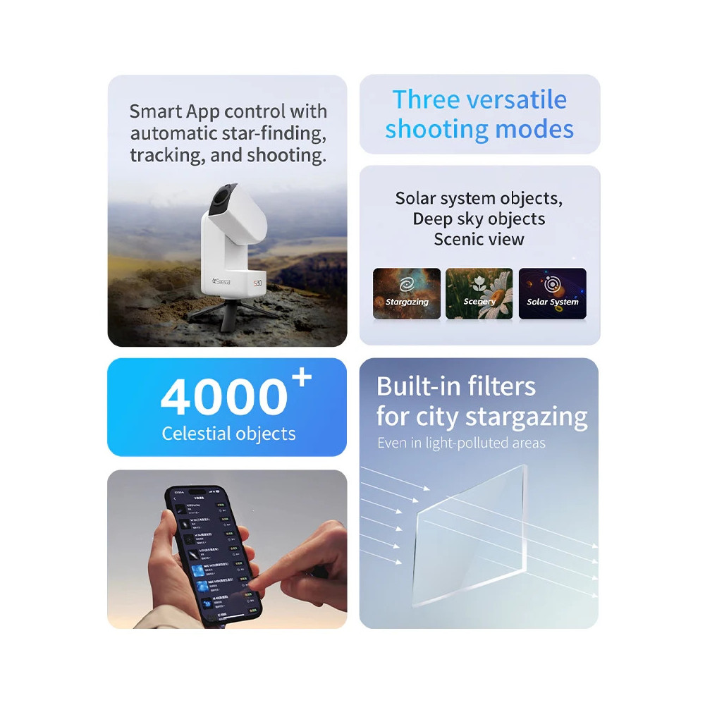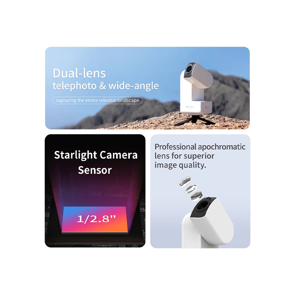Ať už chcete pozorovat planety, mlhoviny, nebo jen krásnou krajinu, s teleskopem Seestar S30 to zvládne každý. Díky apochromatické optice a citlivému snímači získáte vždy ostré a jasné záběry. Navíc s automatickým vyhledáváním objektů nebylo pozorování nikdy snazší.